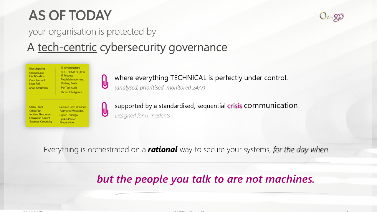 Disclaimer : Oz’n’gO’s engagements assume that the essential foundation of technical cybersecurity is already in place. If this is not the case, we bring in our experts, who will work alongside your existing technical partners