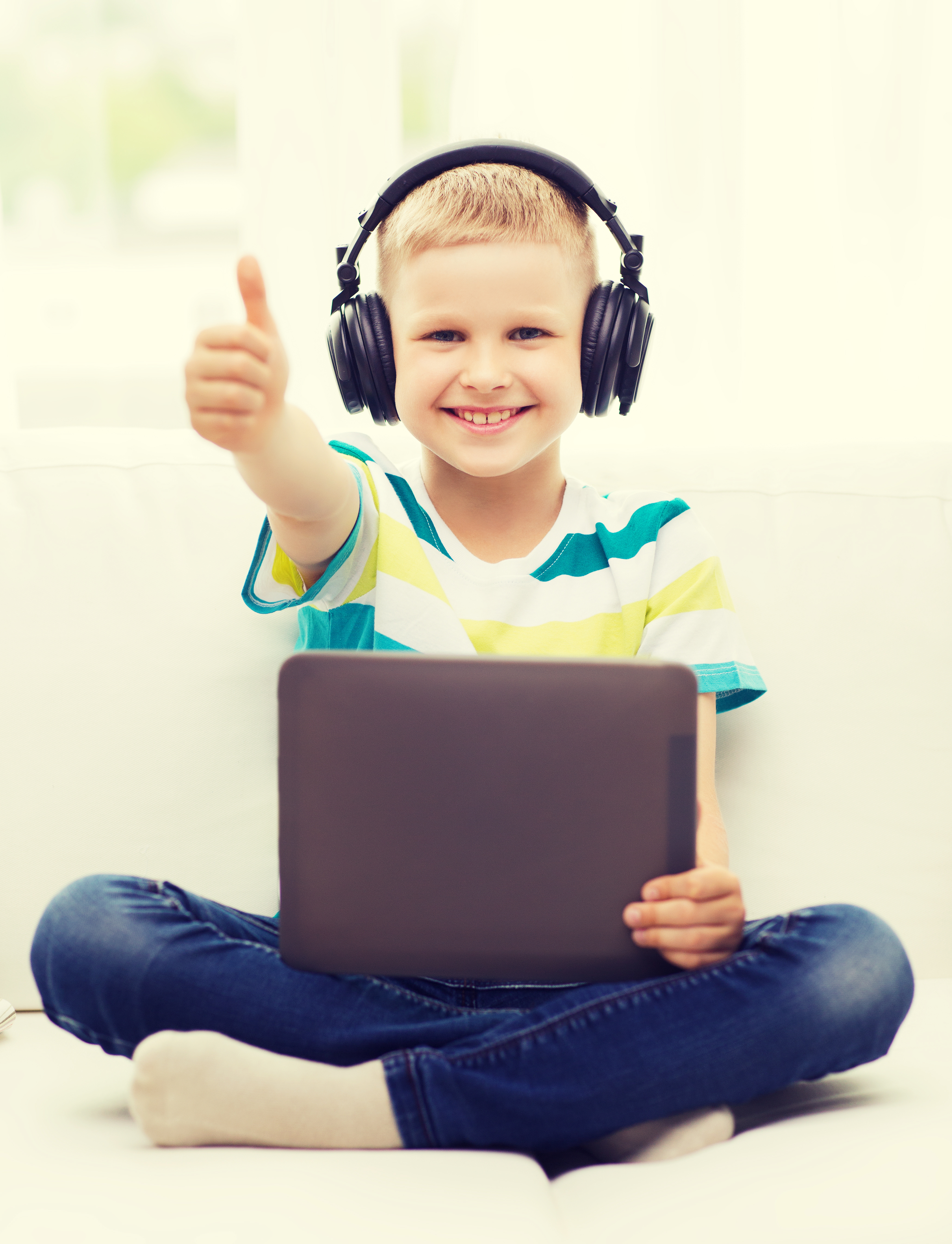 little boy with tablet pc and headphones at home
