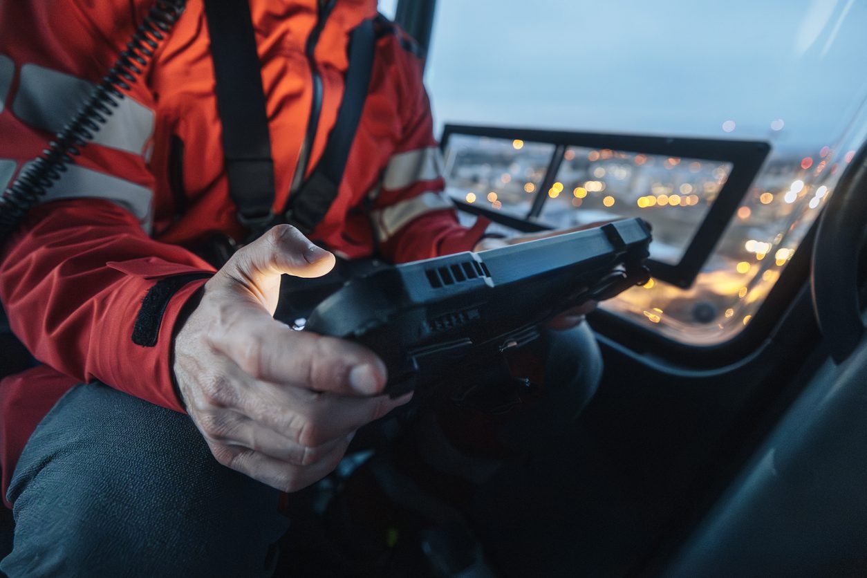 Doctor inside helicopter emergency medical service while using digital tablet